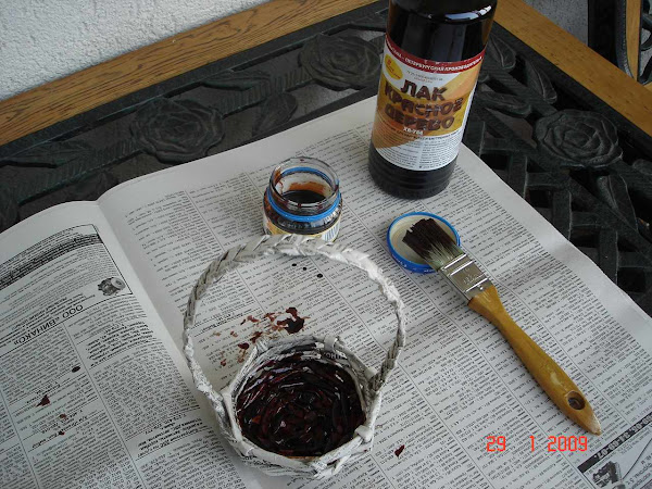На следующий день можно уже красить. Я красила лаком Красное дерево. Перед покраской необходимо уже окончательно выровнять корзинку - так как потом от краски она станет жесткой